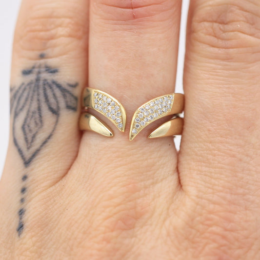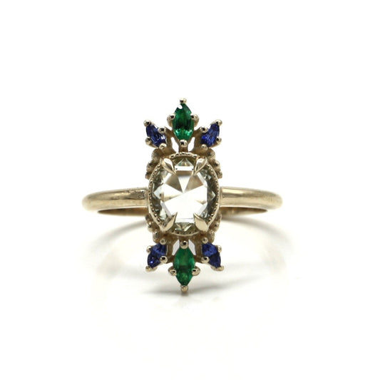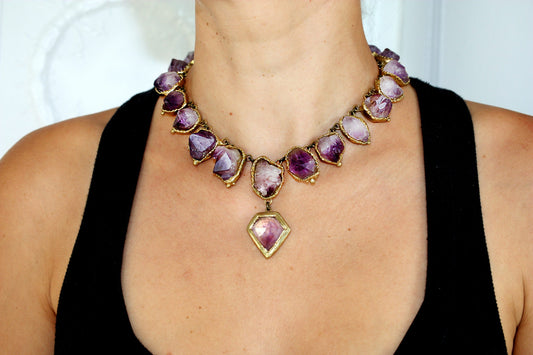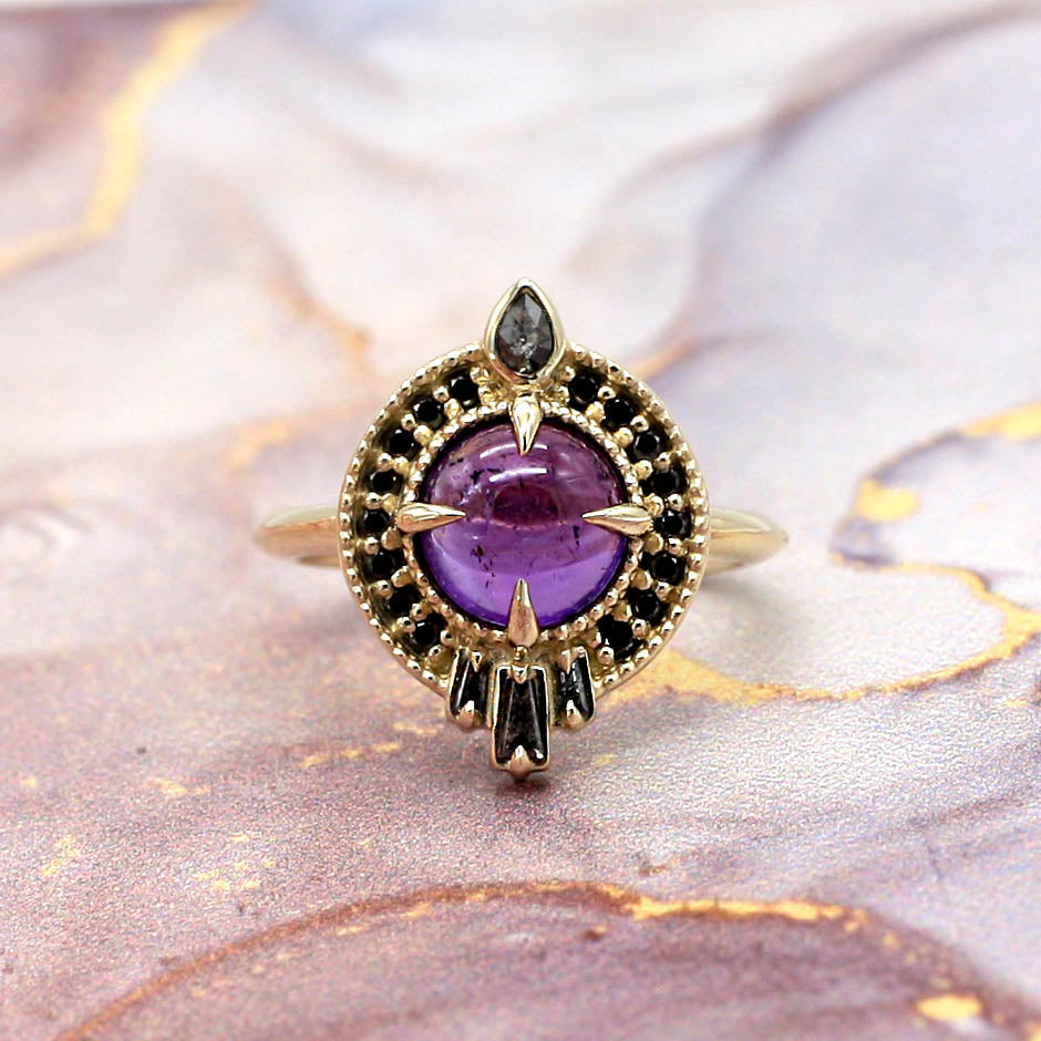 I seek out stones that feel like secrets—unusual cuts, rare hues, each one with its own energy. Once chosen, each setting is created to be raw, angular, unapologetically bold. The result is modern armour with ancient echoes—sculptural forms that feel like they were pulled from the past. It’s jewellery for the divine feminine in her darker form—the warrior, the sorceress, the goddess reborn.