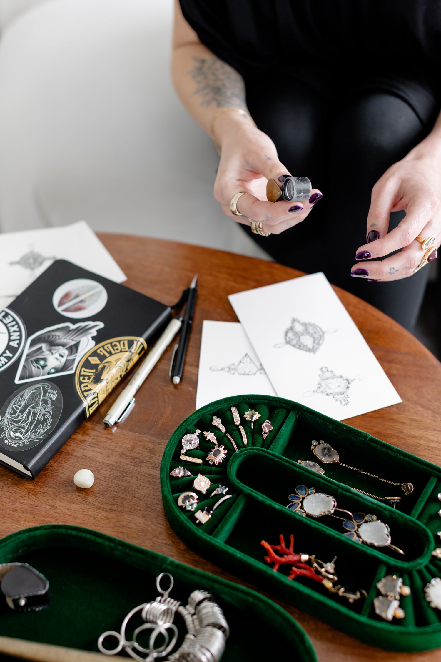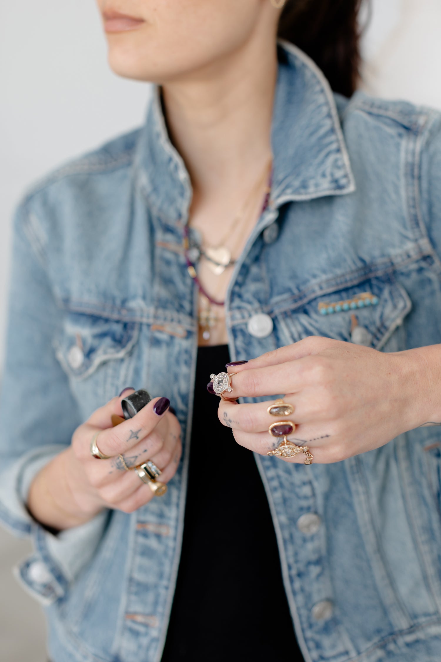 Perfection has never interested me. I leave the marks of my tools—hammer strokes, raw textures, subtle asymmetries—like inscriptions of the process. I choose stones for their presence, not just their sparkle: moody hues, inner fire, fractured light. I start with the gems and let them lead, like puzzle pieces revealing their own story.