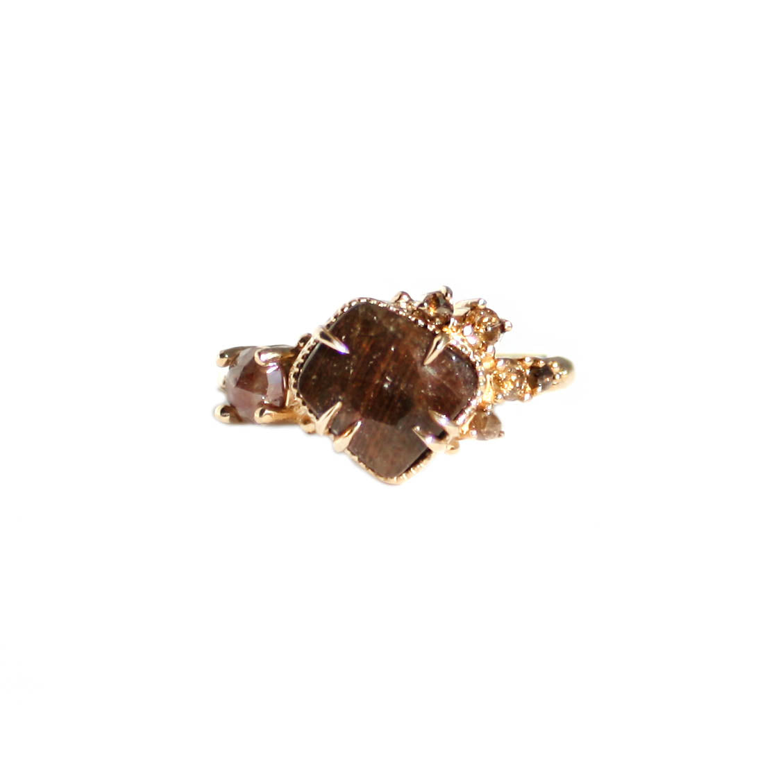 This asymmetric, cluster ring features a chocolate custom-cut sapphire measuring ~8.6mm x 8.3mm and various champagne diamonds measuring beteen 4.3mm - 1.5mm as accents. They are claw set into 10k yellow gold with granulated and milgrain details and a round band.