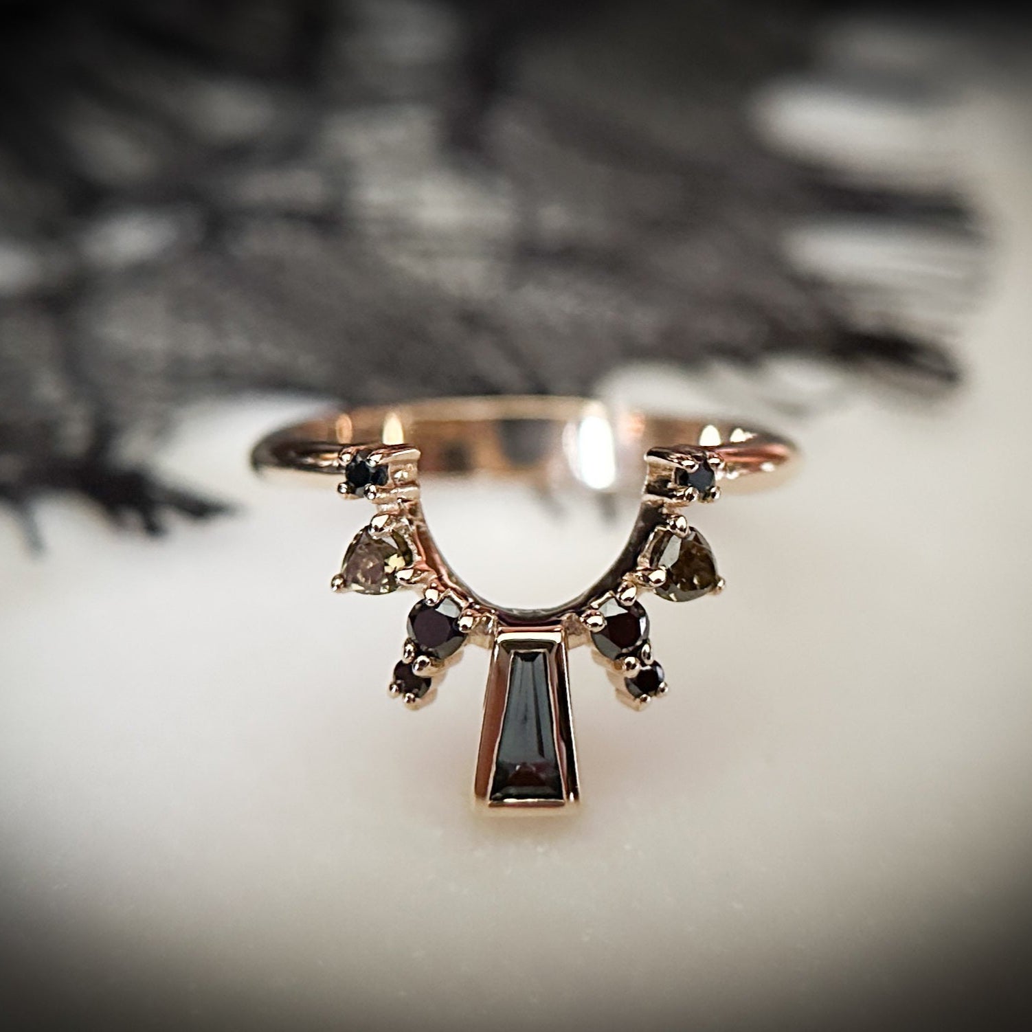 Looking for a unique wedding band to add a bit of moody glam to your stack?  This is your ring!  Crafted with the utmost sophistication, this design gives an aura of opulence, providing an elegant breathing space between each element of your wedding set. This ring allows each distinct ring to command its own spotlight, giving you a stack of unparalleled brilliance and individuality.  She features a teal green tapered baguette sapphire in the centre surrounded by both black and olive green diamonds.