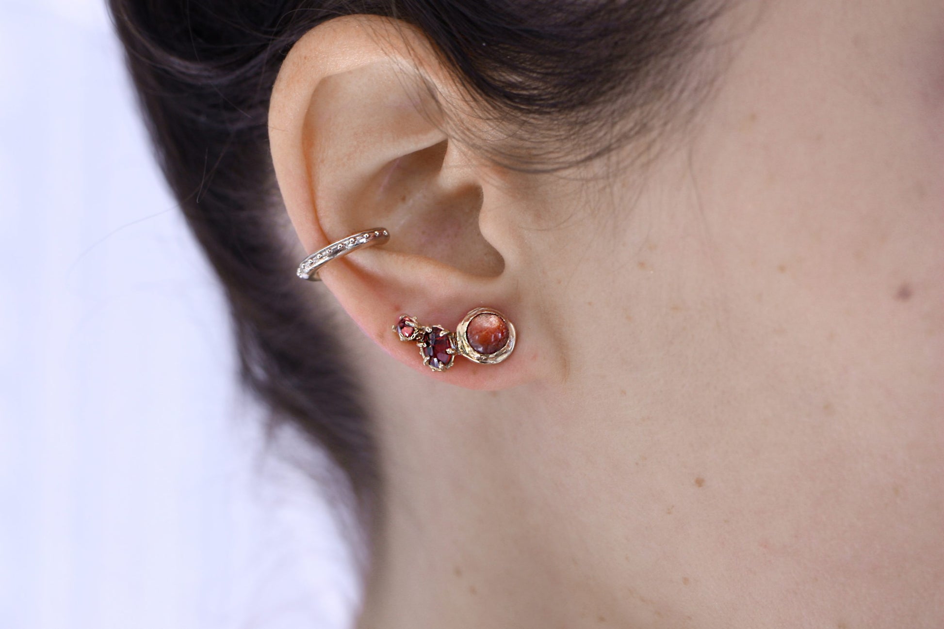 This single, warm toned ear climber features a 6mm, round cabochon Oregon sunstone, a 6mm x 4mm inverted, faceted oval garnet and a 3mm round, inverted, faceted garnet set into brass settings with a gold filled ear wire and a shiny finish.