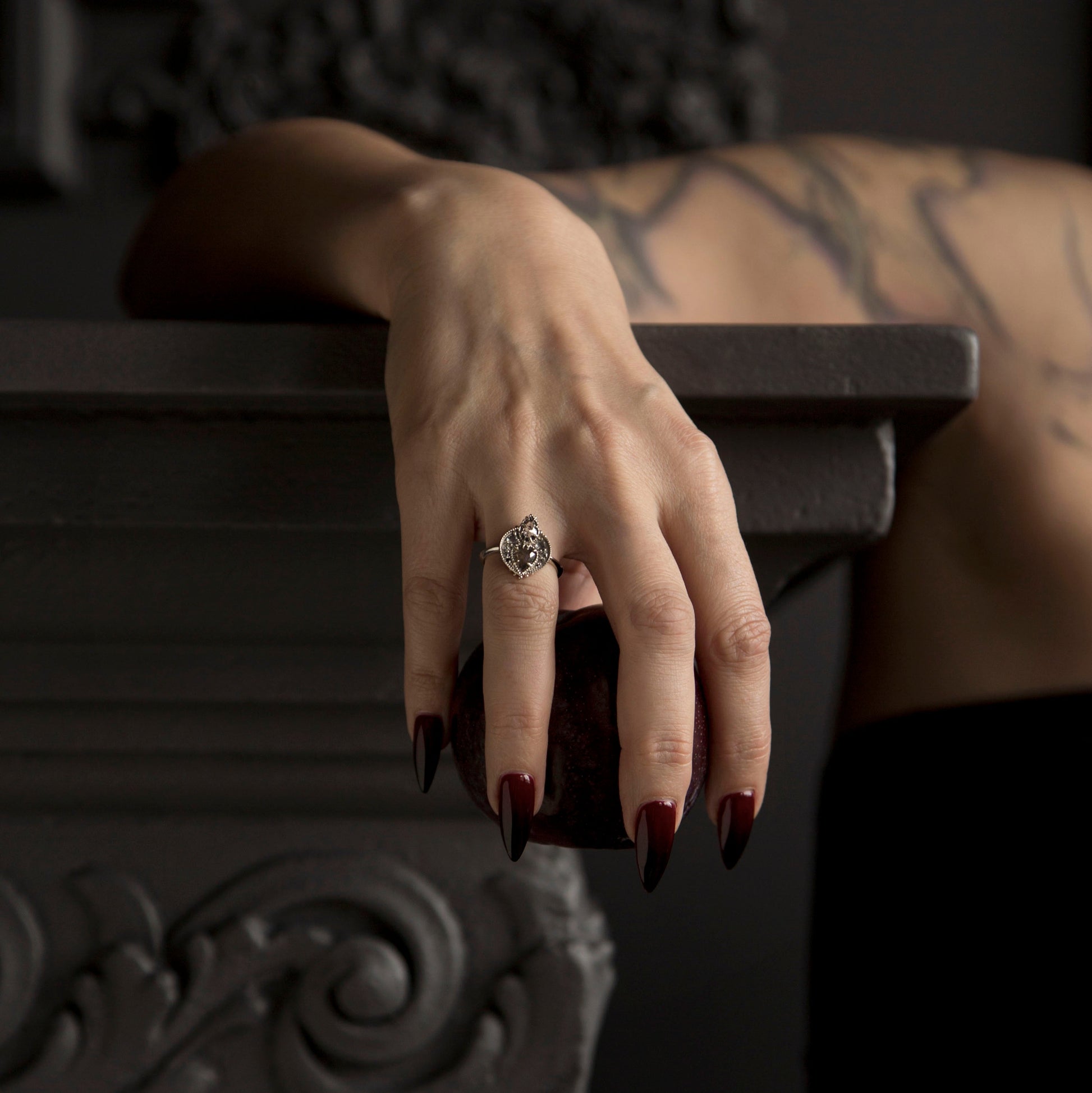 This drop-dead beauty features a 0.58ct, rose cut, grey, pear shaped diamond of I3 clarity, mirrored by a smaller 0.36ct salt and pepper pear shaped diamond and surrounded by graduated, rose cut and faceted, salt and pepper and black diamonds measuring from 3mm - 0.9mm to form a partial halo. They are claw and bead set into 10k white gold ring with a knife edge band. She would be a truly spectacular engagement ring for the woman who likes a bold piece.