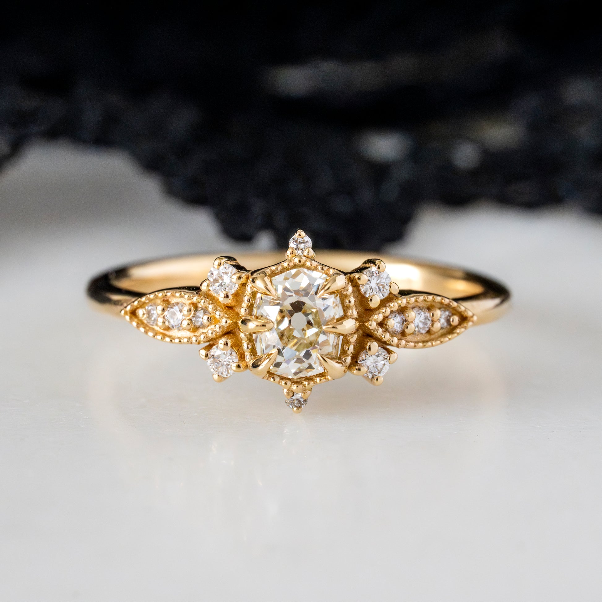 The Stella ring is a quiet constellation of light — a whisper of brilliance suspended in gold. At its heart glows a 0.35ct antique Old European cut diamond, alive with the soft, candlelit shimmer only time can give. Surrounding it, twelve white diamonds glint like distant stars, their delicate fire scattered across a setting of warm 10k yellow gold.