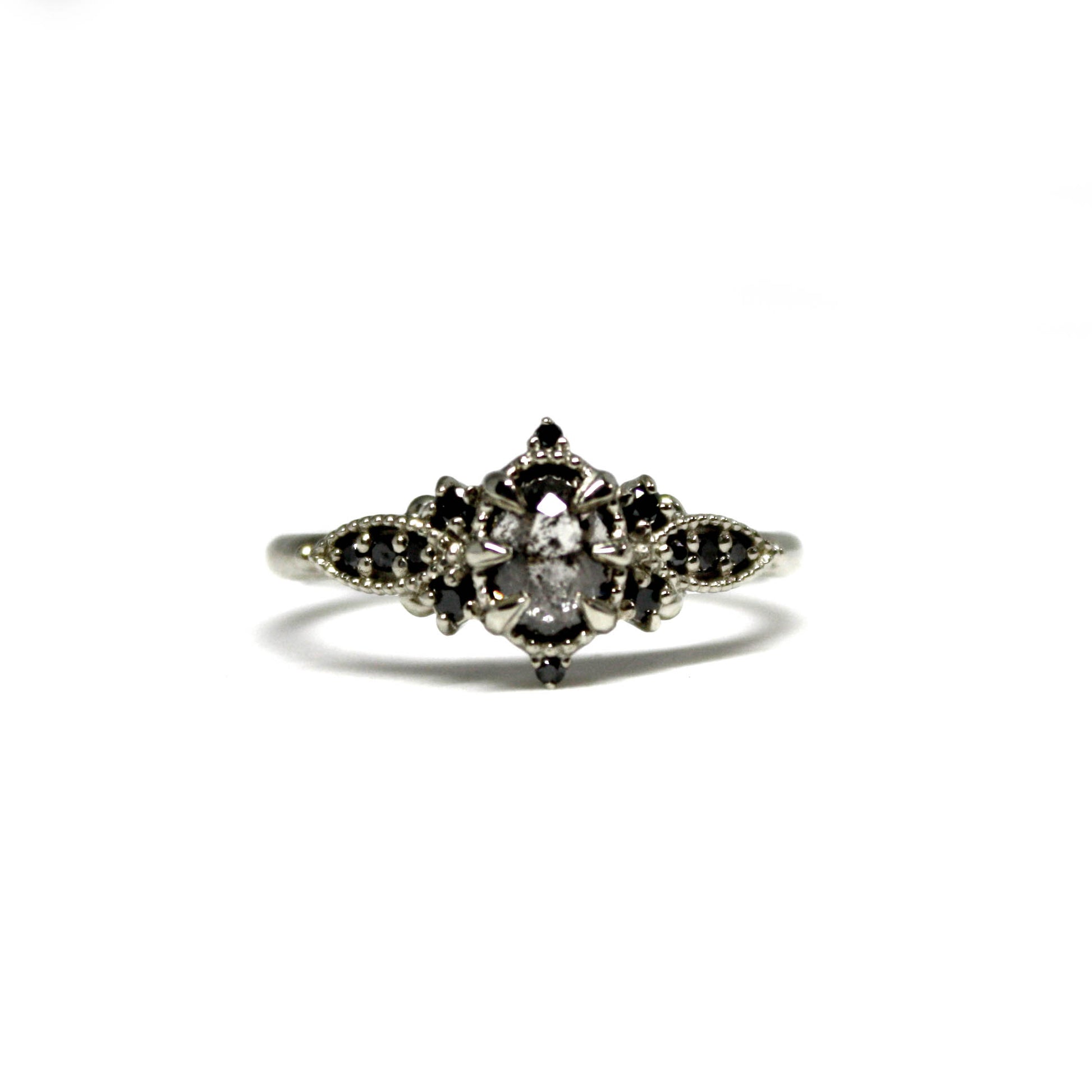 If you're into that moody, darkly glamorous vibe with a bit of girliness thrown in, this ring is the one for you. She features a 0.50ct, silvery, rose cut, oval diamond, surrounded by black diamonds in a floral design. The smaller diamonds measure 1mm-1.5mm. They are claw and bead set into 10k white gold ring with a rounded band.